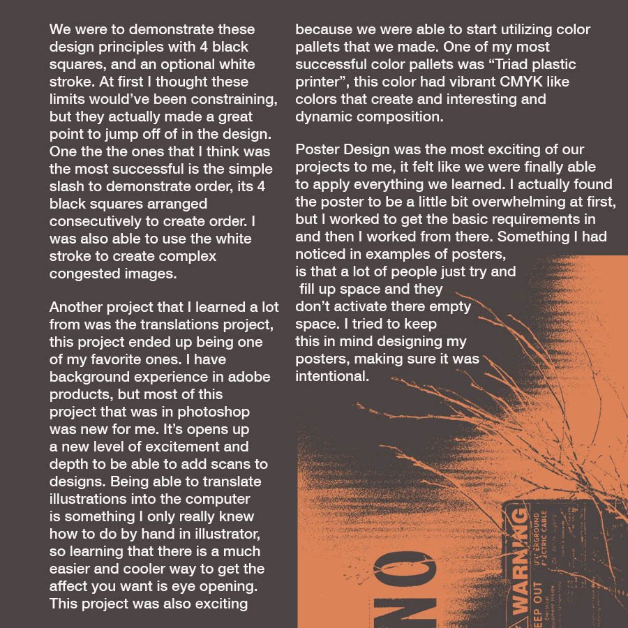 The final project of the graphic design process class was to create a 100 page 6X6 booklet of everything we had made in the class. Most of the work was already done for us, as its what the semester had been leading up too. I chose to include my 3 favorite of each section and the section pages in-between as thats mostly what this project was about. Coming up with a theme and keeping it consistent between the pages.