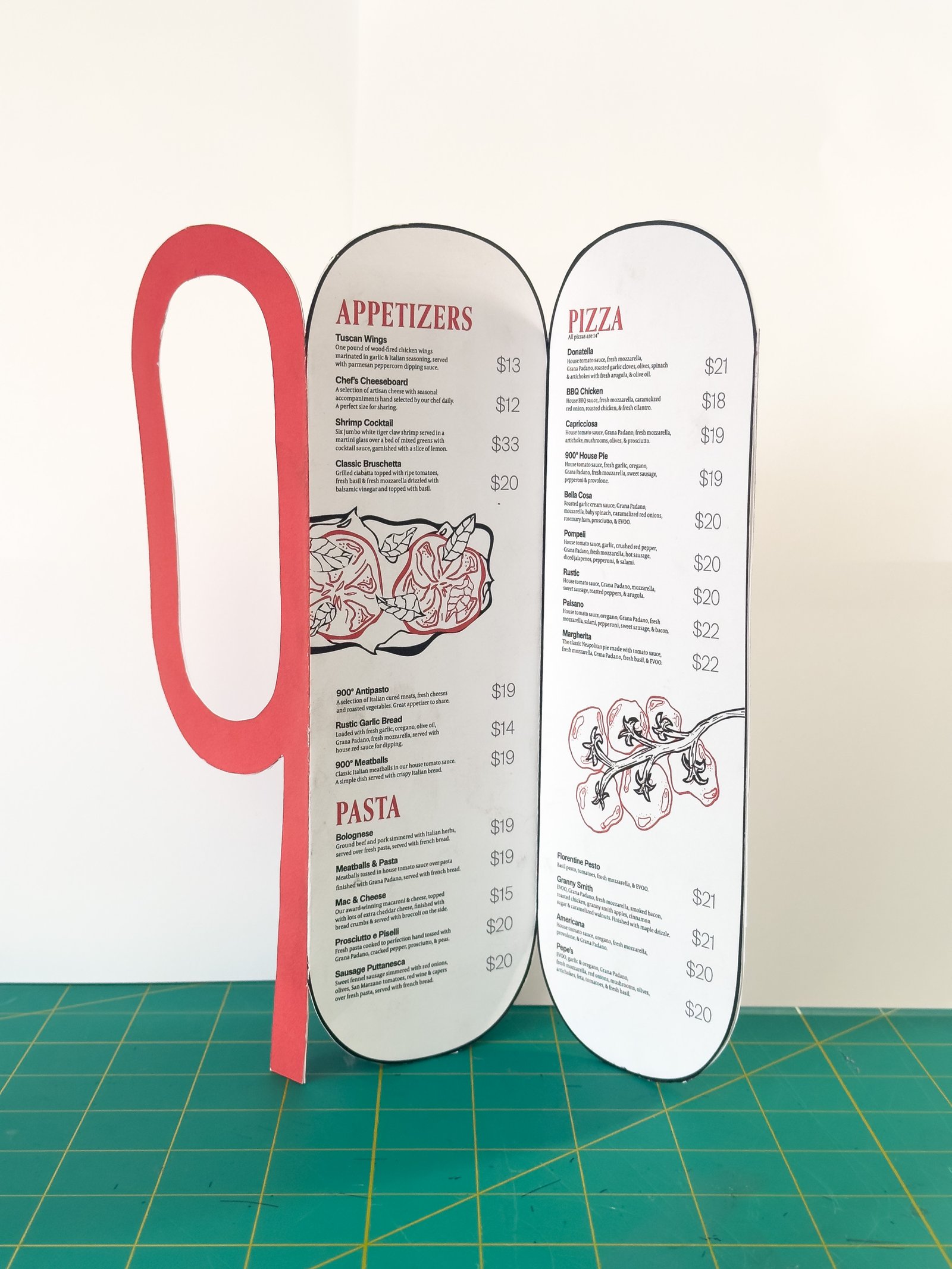 This project was to design a menu for a local restaurant. We were to go to the restaurant and experience what it was like and take pictures of there existing menu. From this we translated all of the text and began to formulate ideas. I wanted to create a unique form of the magazine that would really stand out. I made an accordion fold 900 shape from a custom typeface.