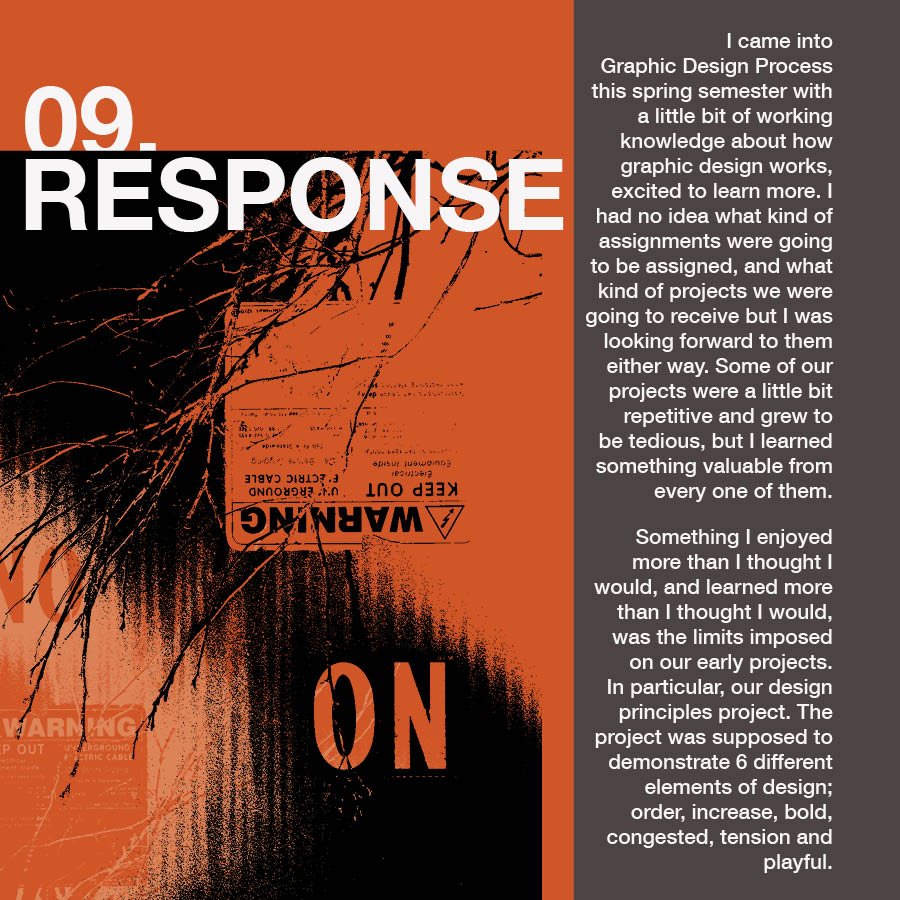 The final project of the graphic design process class was to create a 100 page 6X6 booklet of everything we had made in the class. Most of the work was already done for us, as its what the semester had been leading up too. I chose to include my 3 favorite of each section and the section pages in-between as thats mostly what this project was about. Coming up with a theme and keeping it consistent between the pages.